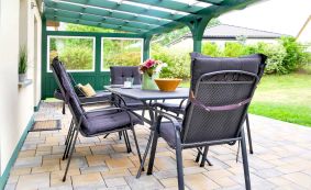 - überdachte Terrasse mit Gartenmöbeln und Liegen