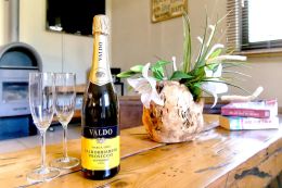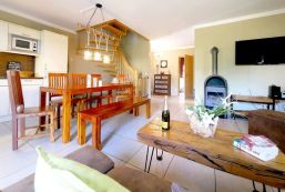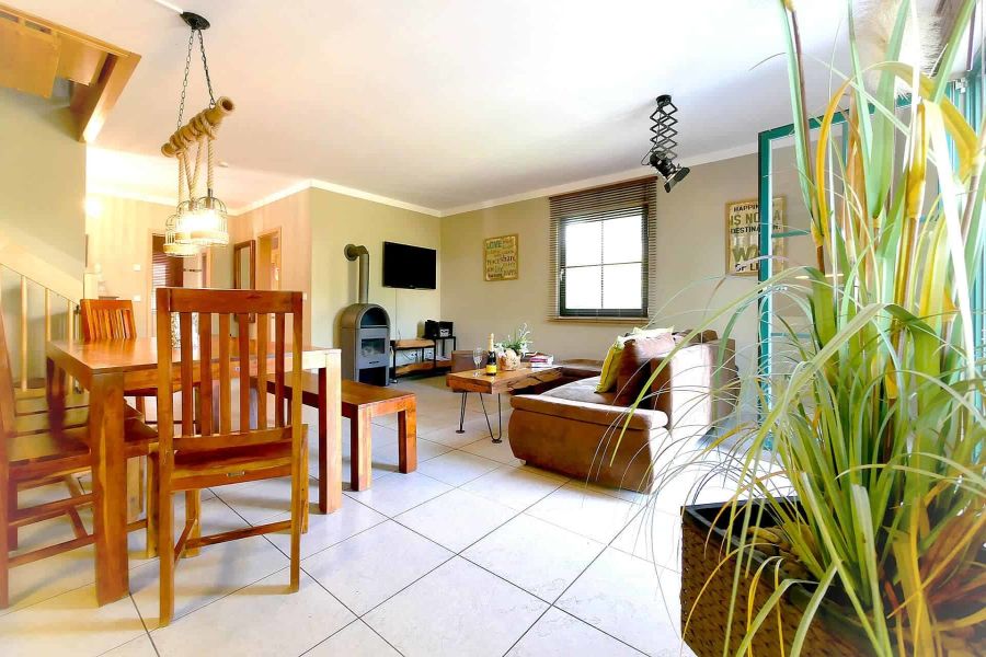 - 1 Wohnraum mit Kaminofen, Sitzgarnitur, Couchtisch, Fernseher, Stereo-Anlage, Essbereich mit 6 Stühlen