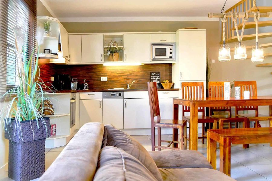 - inkl. Küche mit Spülmaschine, Herd mit Backofen, Mikrowelle, Kühlschrank mit Tiefkühlfach, Kaffeemaschine, Wasserkocher, Toaster, Geschirr, Gläser, div. Kochzubehör